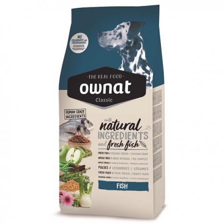 Ownat elaborou esta comida seca com sabor de peixe. É um alimento seco indicado para a nutrição diária de cães adultos de qualquer tamanho ou raça. O peixe é uma fonte importante de proteína para o animal que também fornece um extra de ácidos graxos para mantê-lo mais saudável.