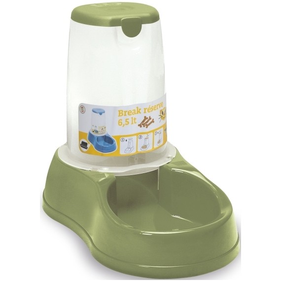 Comedouro de plástico com reservatório que repõe a ração, por ação da gravidade, à medida que o animal se alimenta. É de fácil limpeza e higienização por ser de plástico e desmontável.